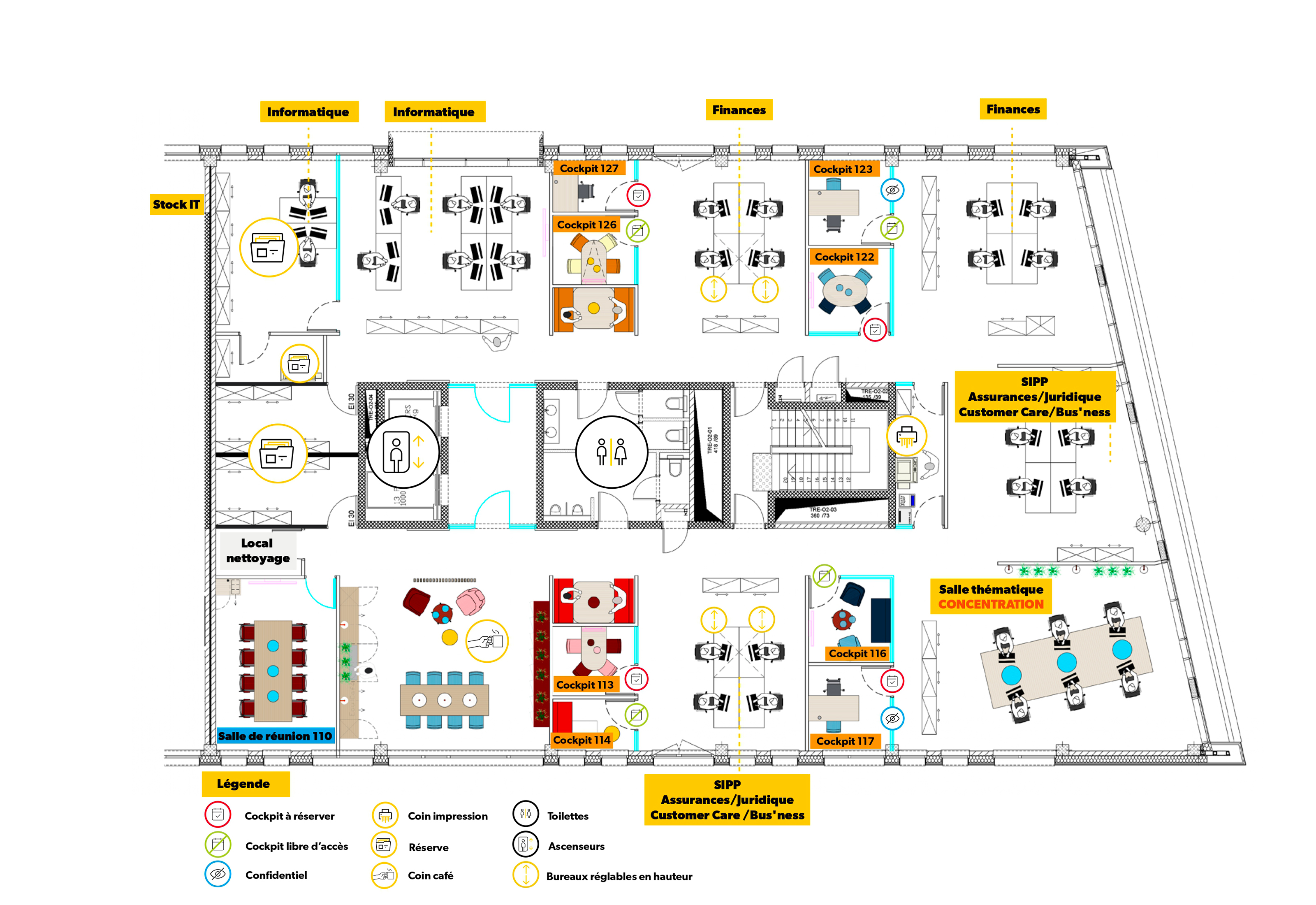 Au 1er étage, plusieurs services administratifs retrouvent leur point d’ancrage : les services SIPP, Finances, comprenant notamment le service Clients externes ainsi que Fin B.P. mais également Le customer care, le service juridique et Assurances, busness ainsi que l’équipe IT (informatique).